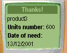Next, we allow the user to give the rest of data we need from him (number of units, date when it's needed), we added here the "format" attribute for the <input> tag to make it easier to give inputs, in the first one we set it to "*N", that means that the user can give any number of units she/he wants, in the second one we set some fixed characters by preceding them with "\" and we allow entering just numbers for the date. Finally and as we have done at the end of "storelogin.wml" we collect all the data and we send it to the server with the request for the last file in our application order.asp which we will discuss next. A cancel link was added to cancel everything and return back to the login deck if needed. |