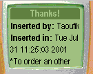 Because we used the default method to send data from store.asp, so we get it using the Request's QueryString( ) method. After that we open the connection in the same way we did last time and we give the query we need using the SQL's INSERT INTO... statement which we excute this time by the help of the Connection's Excute( ) method. (you can see that we added also the date of the order (Now( )) and the user name (sendername) in the SQL query) Finally, we gave the user the opportunity to see his data which have been sent and we are done. (It's very possible to give the user the advantage of being able to delete those data if she/he notice a mistake, or replace them with something else... I leave this task to who likes maybe to improve this application in this way). |